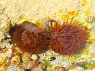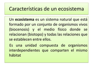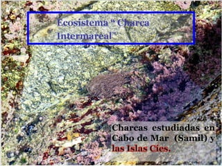 El documento describe las características de un ecosistema de charcas intermareales. Incluye una lista de organismos como lapas, algas y moluscos. Explica las relaciones tróficas entre productores, consumidores primarios y secundarios. También describe adaptaciones como el mimetismo y comportamientos como la densoactividad para sobrevivir en el ecosistema.