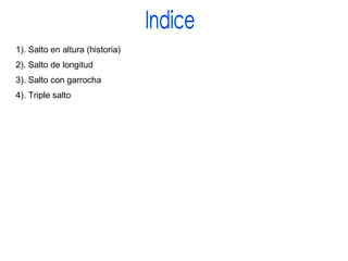 El documento resume los diferentes tipos de saltos en atletismo, incluyendo salto en altura, salto de longitud, salto con garrocha y triple salto. Detalla la historia y evolución de las técnicas de cada prueba y proporciona información sobre los récords mundiales.