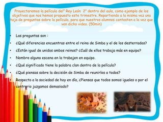 El documento propone proyectar las películas "Rey León 2" y "Up" en el aula para que los estudiantes respondan preguntas relacionadas con los temas y objetivos de la unidad mientras ven las películas. Las preguntas sobre "Rey León 2" exploran las diferencias entre los reinos de Simba y los desterrados y el significado de la palabra "clan", mientras que "Up" será seguida por una discusión en grupos sobre lo que más y menos les gustó para explicar valores como ayudar a los mayores y el cuidado