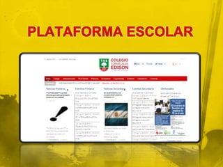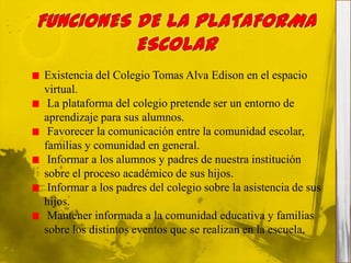 El documento describe la existencia de una plataforma virtual para el Colegio Tomas Alva Edison, la cual pretende ser un entorno de aprendizaje para los alumnos y favorecer la comunicación entre la comunidad escolar, familias y público en general. La plataforma también busca informar a los alumnos, padres y comunidad sobre el progreso académico, asistencia y eventos escolares.
