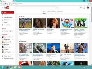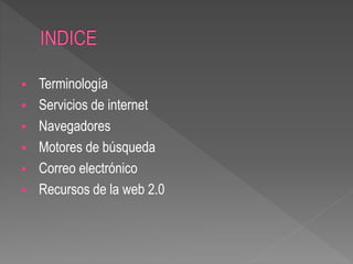 El documento habla sobre los servicios de Internet y sus principales características. Define términos como correo electrónico, redes sociales, videoconferencia, chat y descarga de programas. También explica servicios como el comercio electrónico. Finalmente, resume varios navegadores y motores de búsqueda populares como Google, Yahoo, Bing, AltaVista y Yippy.
