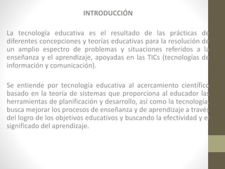 Este documento trata sobre la tecnología educativa y el uso de las TIC en la educación. Explora el concepto de tecnología educativa, los diferentes enfoques sobre la sociedad de la información, y los retos que plantean las nuevas tecnologías para la educación. También analiza el papel de los materiales didácticos, la integración de las TIC en la escuela y el desarrollo de competencias digitales en los estudiantes.