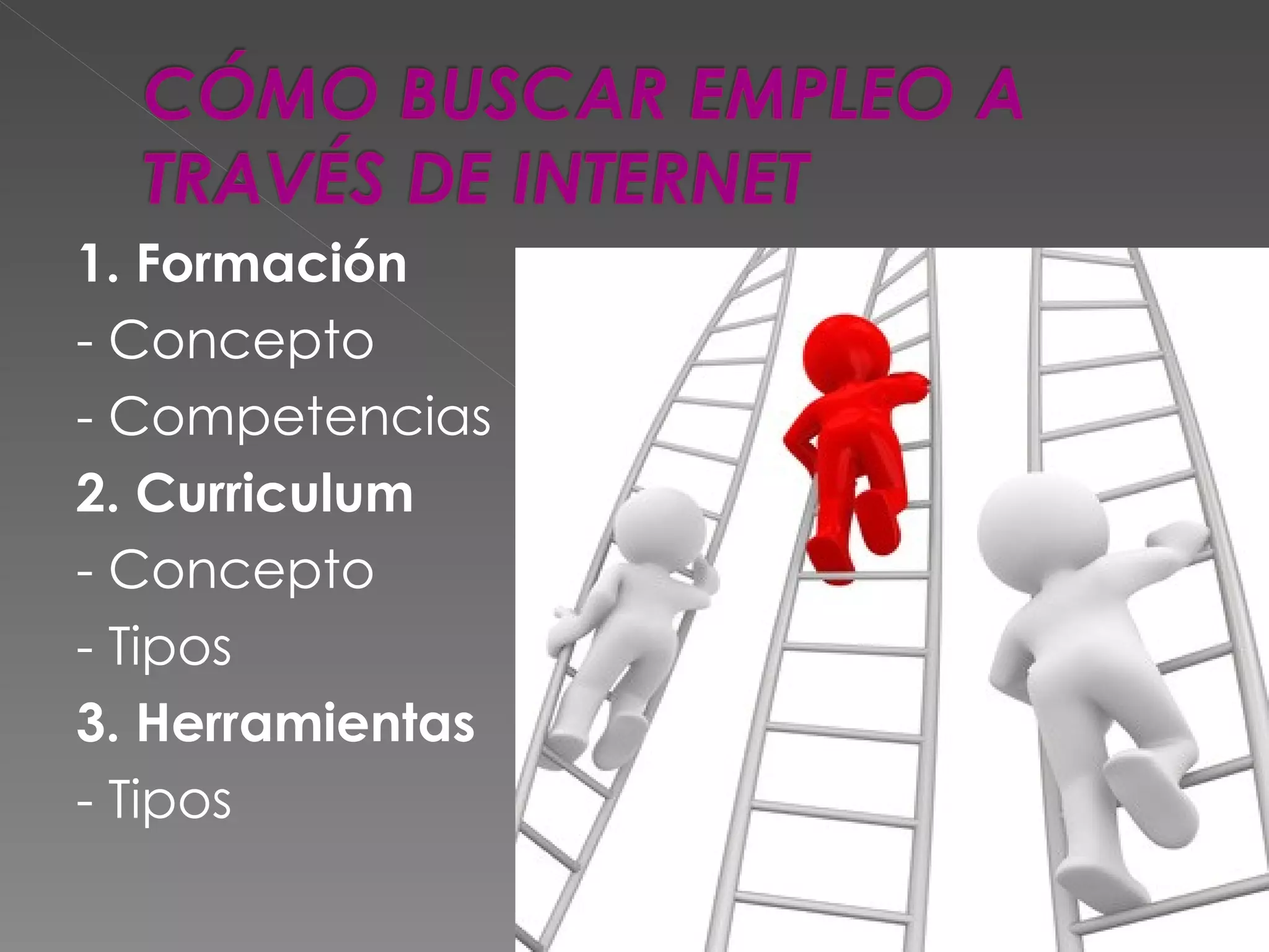 Este documento resume diferentes conceptos relacionados con la formación juvenil e información laboral, incluyendo las competencias, tipos de currículum, herramientas para encontrar trabajo y sitios web para buscar oportunidades laborales.