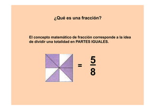Este documento explica el concepto de fracciones. Una fracción representa la división de un entero en partes iguales, donde el numerador indica las partes consideradas y el denominador indica el número total de partes. Se proveen ejemplos de fracciones como 2/6, 3/10 y ejercicios para escribir fracciones a partir de figuras divididas.