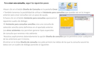 Este documento describe los tipos principales de consultas en SQL y los pasos para crear una consulta. Las consultas de selección extraen datos de una tabla que cumplen criterios específicos, mientras que las consultas de acción realizan cambios a los registros como eliminación, actualización o creación de tablas. Para crear una consulta, se seleccionan las tablas relevantes en el diseñador de consultas o mediante el asistente para consultas sencillas.