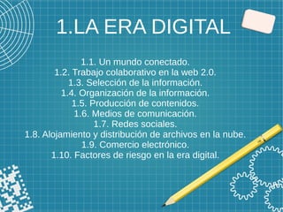 El documento habla sobre la era digital y sus aspectos principales. Trata sobre el mundo conectado a través de Internet, el trabajo colaborativo en la web 2.0, la selección y organización de información, la producción de contenidos, los medios de comunicación y redes sociales, el alojamiento en la nube, el comercio electrónico y los factores de riesgo en la era digital como la brecha digital y las tecnoadicciones.