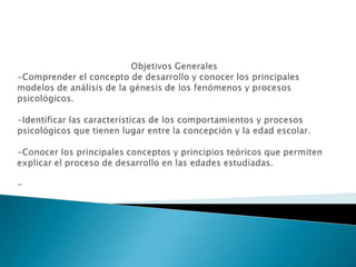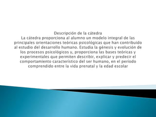 La cátedra de Psicología del Desarrollo del Infante al Adulto cubre los principales conceptos básicos, teorías y modelos del desarrollo como el mecanicista, organicista y contextual. Explora también las etapas del desarrollo cognitivo y socio-cultural como la niñez, adolescencia y juventud.