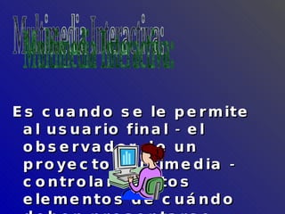 El documento describe los conceptos fundamentales de multimedia, incluyendo que es cualquier combinación de texto, gráficos, sonido y video que llega a nosotros por medios electrónicos. Explica que la multimedia interactiva permite al usuario controlar elementos como cuándo se presentan y navegar no linealmente a través de enlaces. También describe dispositivos de almacenamiento como discos flexibles y discos duros, y herramientas como pintura y dibujo 3D que son importantes para el desarrollo de multimedia.