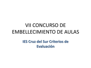 El documento describe los criterios de evaluación para un concurso de embellecimiento de aulas. Los criterios incluyen limpieza, orden, decoración y reciclaje. La limpieza se evaluará en base al estado de la pizarra, mesas y superficies. El orden considera la colocación de mesas, sillas y la ubicación de pertenencias. La decoración valora el uso de carteles y diseños. El reciclaje analiza la ubicación de puntos de recolección y las instrucciones de separación de residuos.