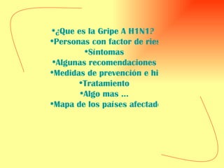 Este documento resume la gripe A H1N1, incluyendo que es una pandemia causada por una variante del virus de la influenza A de origen porcino. Describe los síntomas, las personas en riesgo, las recomendaciones de prevención e higiene, y el tratamiento. También proporciona datos sobre los casos confirmados y muertes en la provincia de Santa Fe en Argentina.