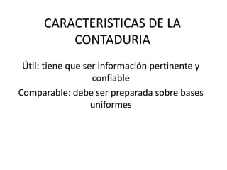 El documento describe las características y objetivos de la contaduría. La contaduría tiene como objetivo representar el patrimonio de una empresa para determinar sus ganancias y apoyar la toma de decisiones de los administradores. También vigila los bienes y recursos de la empresa y se asegura de que cumpla con sus obligaciones.