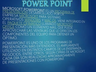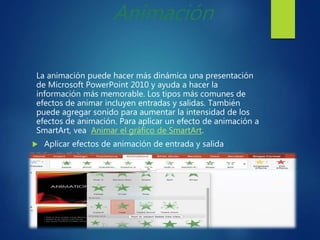 Este documento proporciona instrucciones sobre cómo agregar animación, imágenes y videos a una presentación de PowerPoint. Explica que la animación puede hacer que una presentación sea más dinámica y ayude a que la información sea más memorable. Luego, detalla cómo aplicar efectos de entrada y salida a texto u objetos, e insertar imágenes y videos desde el equipo en una diapositiva.