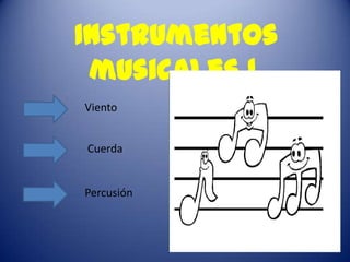 Este documento clasifica los instrumentos musicales en tres categorías principales: instrumentos de viento, instrumentos de cuerda e instrumentos de percusión. Proporciona detalles sobre los tipos de instrumentos que pertenecen a cada categoría y explica que la clasificación actual data de 1914 cuando Hornbostel y Sachs la establecieron. También menciona brevemente la marcha Radetzky de Johann Strauss compuesta en 1848.