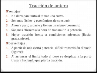 El documento compara y contrasta los sistemas de tracción delantera y trasera. La tracción delantera tiene ventajas como un mejor agarre, ser más eficiente y tener un mejor control, mientras que la tracción trasera tiene una mejor aceleración pero puede perder agarre más fácilmente en curvas. Ambos sistemas tienen sus usos dependiendo del tipo de vehículo.