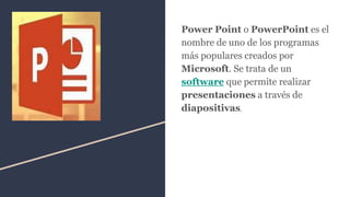 PowerPoint es un popular software de Microsoft para crear presentaciones mediante diapositivas. Permite insertar texto, imágenes, video y sonido de manera coordinada para presentar información de forma organizada y dinámica a través de enlaces entre diapositivas. Si bien facilita la creación y proyección de presentaciones, también puede resultar en ideas jerárquicas que distraigan u opciones de presentación simplistas.