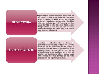 La autora dedica este trabajo a Dios y a sus padres por darle la vida y apoyarla. Agradece profundamente a Dios y a sus padres por guiarla y enseñarle valores. Luego presenta una breve introducción sobre su fecha de nacimiento, sus padres y sus estudios primarios y secundarios.