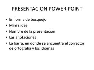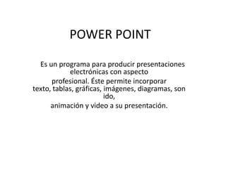 PowerPoint es un programa que permite crear presentaciones profesionales incorporando texto, imágenes, gráficos, videos y más. Ofrece varias herramientas para diseñar diapositivas y agregar elementos de manera animada. Los usuarios pueden crear, editar y mostrar presentaciones de manera fácil e interactiva.