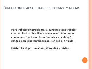 Este documento explica los tres tipos de referencias a celdas en planillas de cálculo: referencias relativas, absolutas y mixtas. Las referencias relativas cambian automáticamente cuando se copian fórmulas a otras celdas, las absolutas mantienen siempre la misma referencia, y las mixtas mantienen fija una columna o fila y ajustan la otra. Se proveen ejemplos para ilustrar cada tipo de referencia.