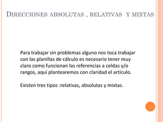Este documento explica los tres tipos de referencias en hojas de cálculo: referencias relativas, absolutas y mixtas. Las referencias relativas cambian automáticamente cuando se mueve o copia la fórmula, las absolutas permanecen fijas, y las mixtas tienen una parte fija y otra variable. Se proveen ejemplos para ilustrar cada tipo de referencia.