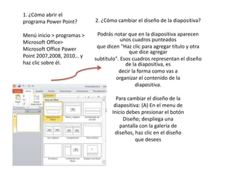 Este documento proporciona instrucciones paso a paso sobre cómo utilizar diferentes funciones de Microsoft PowerPoint. Explica cómo insertar diapositivas nuevas, cambiar diseños, aplicar efectos de animación y transición, y agregar hipervínculos, botones de acción e imágenes. También cubre cómo grabar narraciones, organizar notas del orador e insertar tablas y SmartArt.