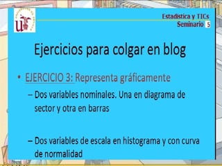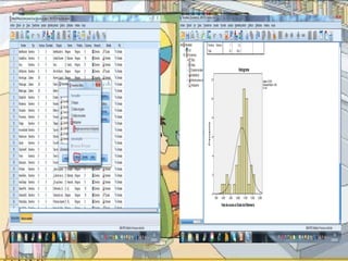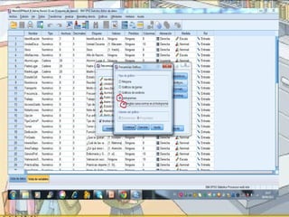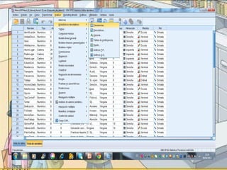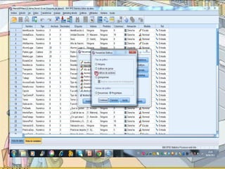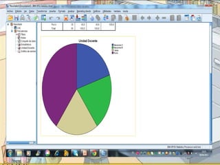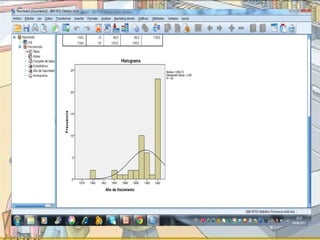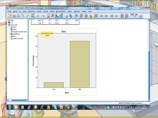 El documento describe los pasos para crear gráficos a partir de datos en SPSS, que incluyen seleccionar la variable deseada en la ventana de Frecuencias, elegir la opción de gráficos, y luego seleccionar el tipo de gráfico apropiado para cada variable, ya sea nominal o de escala.