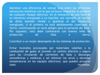 Este documento describe la importancia de un buen sistema de puesta a tierra y diferentes métodos para medir la resistividad del suelo y evaluar los sistemas de puesta a tierra. Explica que la puesta a tierra mantiene la seguridad, el desempeño de equipos y la operación de protecciones. Luego detalla varios métodos comunes para medir la resistividad del suelo como el método de Wenner, de la pendiente y selectivo con pinza.