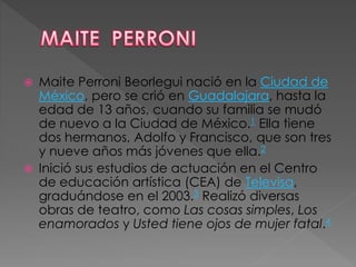 Maite Perroni nació en la Ciudad de México pero se crio en Guadalajara. Estudió actuación en el Centro de Educación Artística de Televisa y se unió al elenco de Rebelde en 2004, donde interpretó a Lupita y formó parte del grupo RBD. En 2008 protagonizó la telenovela Cuidado con el Ángel y lanzó su carrera como solista en 2012 con el sencillo "Te daré mi corazón".