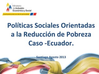 Este documento describe las políticas sociales orientadas a la reducción de la pobreza en Ecuador. En particular, se enfoca en la Política de Inclusión y Movilidad Social del país, la cual tiene como objetivos principales promover la movilidad social y el acompañamiento familiar a través de estrategias como el Plan Familia. El documento también presenta datos demográficos de Ecuador y describe los componentes conceptuales y operativos de la política, incluyendo la protección al ciclo de vida, la promoción de la movilidad social y el acompañamiento a famil