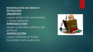 Este documento presenta el proyecto de vida de David Flores, un estudiante de 3er año. Su objetivo es lograr entrar a la universidad y especializarse en turismo para ser profesor. Detalla sus fortalezas, debilidades y las personas que lo han influenciado. Su plan es esforzarse por terminar sus estudios, superar los obstáculos, y convertirse en un profesional para apoyar a su familia.