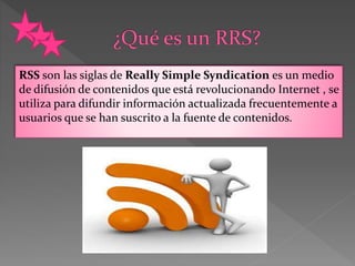 RSS es un medio para difundir contenido actualizado frecuentemente a usuarios suscritos. Los usuarios se suscriben a los feeds RSS de sitios que les interesan y usan lectores RSS para ver automáticamente los nuevos contenidos a medida que son publicados en esos sitios, sin tener que visitarlos manualmente. Algunos lectores RSS populares son BlogLines, los marcadores en vivo de Firefox, y FeedReader.