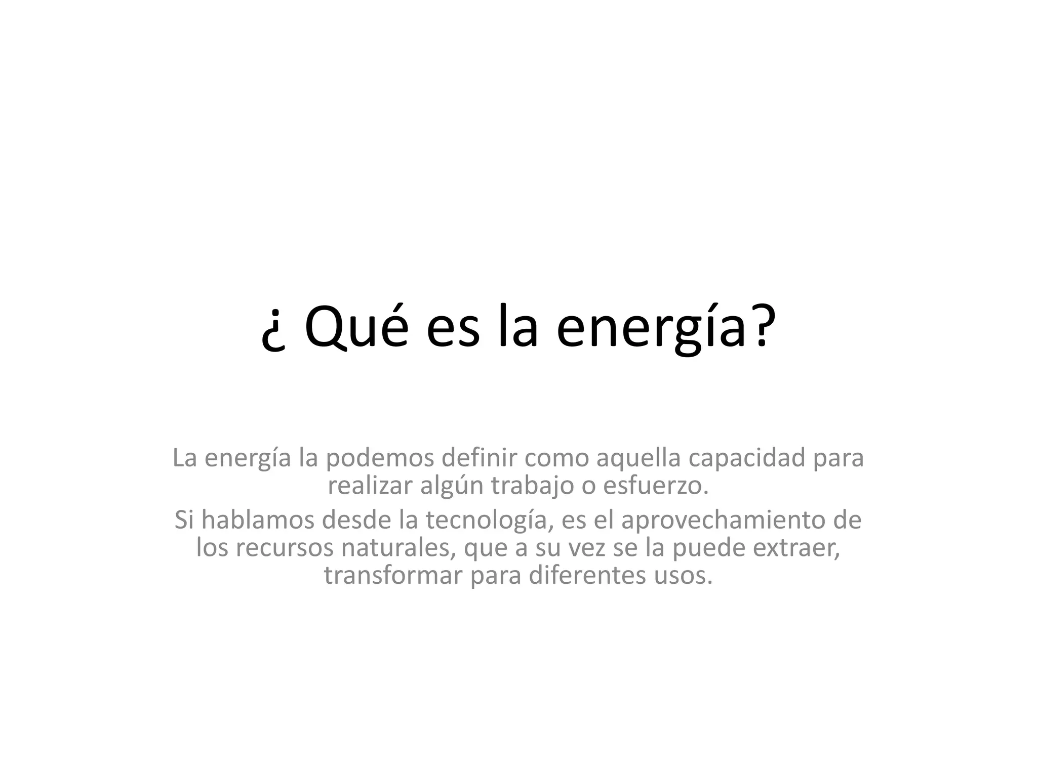 La energía se define como la capacidad de realizar trabajo o esfuerzo, y se obtiene aprovechando los recursos naturales y transformándolos para diferentes usos. Existen energías renovables como la solar, eólica e hidráulica que se regeneran naturalmente, y no renovables como el petróleo, gas y carbón que eventualmente se agotan. La matriz energética de un lugar incluye las fuentes convencionales de combustibles fósiles y las no convencionales emergentes. Algunas como la solar y eólica no contaminan, m