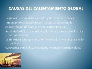 El documento habla sobre el calentamiento global, sus causas y consecuencias. Explica que el calentamiento global es el aumento de la temperatura de la atmósfera y los océanos debido a la acumulación de gases de efecto invernadero producidos por la quema de combustibles fósiles. Esto causa un aumento en la temperatura global, el nivel del mar, y eventos climáticos extremos, trayendo consecuencias como enfermedades, escasez de agua, y daños a la agricultura y biodiversidad.
