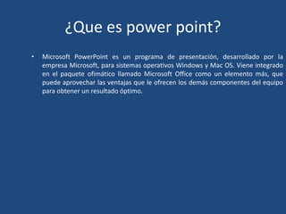 PowerPoint es un programa de presentaciones desarrollado por Microsoft que permite crear presentaciones con diapositivas, texto, imágenes, gráficos y animaciones. Se puede usar para insertar objetos, aplicar diseños de plantillas y fuentes, y realizar presentaciones con animaciones entre diapositivas. PowerPoint ha tenido varias versiones desde la 1.0 hasta la más reciente del 2016.