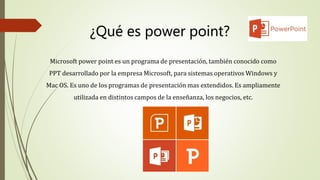 Este documento proporciona información sobre el programa PowerPoint. Explica que PowerPoint es un programa de presentaciones desarrollado por Microsoft que permite crear diapositivas con texto, imágenes y animaciones. Detalla las características, ventajas y desventajas de PowerPoint, así como las funciones de sus iconos y barras de herramientas. También ofrece consejos sobre cómo crear presentaciones efectivas y menciona algunas herramientas web para presentaciones en línea.