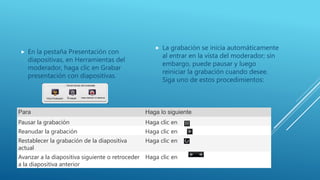 El documento explica cómo grabar presentaciones de PowerPoint, modificar tablas de contenido y añadir hipervínculos. Para grabar una presentación de PowerPoint, se hace clic en "Grabar presentación con diapositivas". Para modificar una tabla de contenido, se aplican estilos de encabezado al texto y luego se inserta y personaliza la tabla. Los hipervínculos contienen una dirección y texto representativo vinculado a esa dirección.