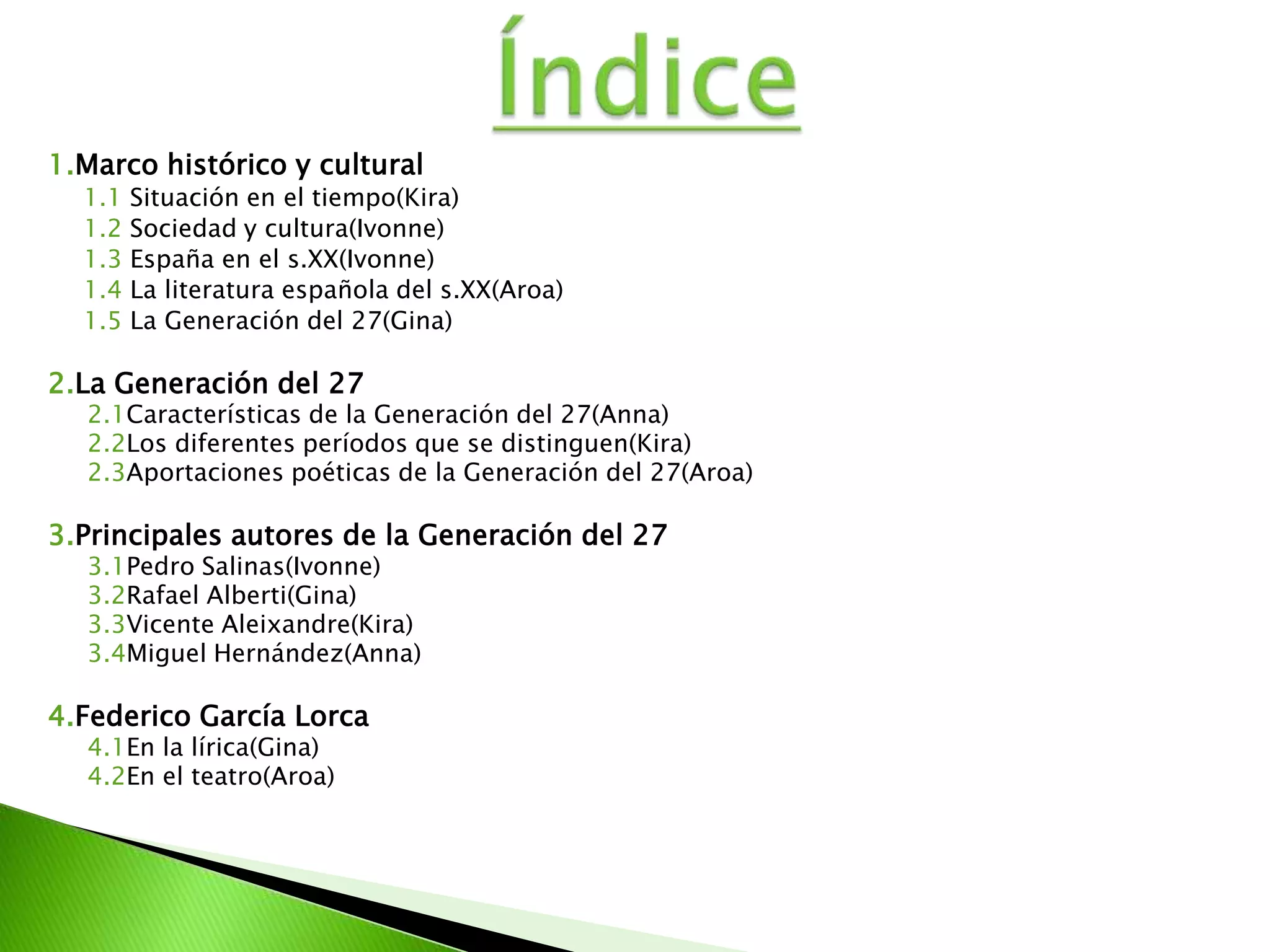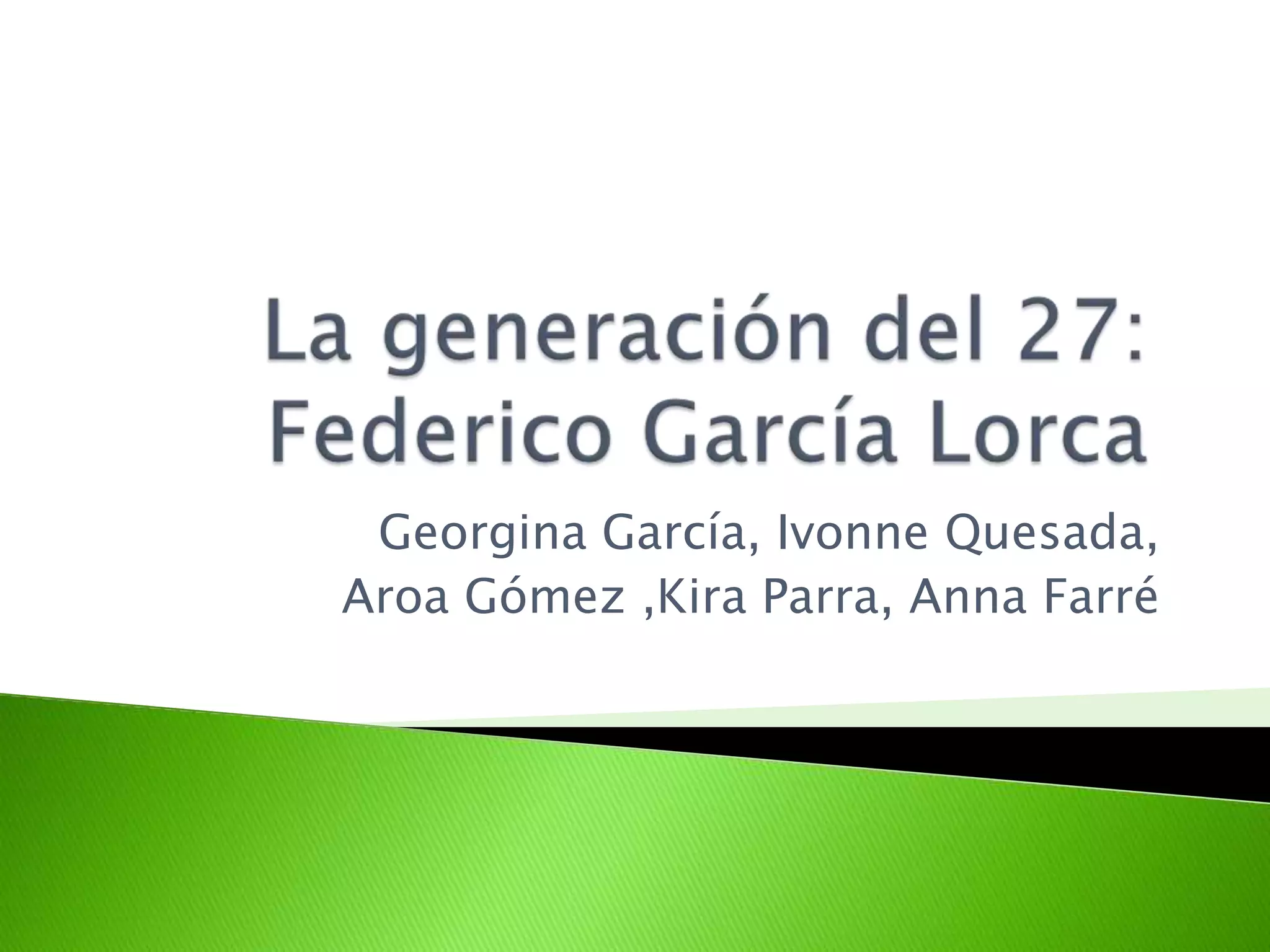 Este documento resume la Generación del 27 en España, un movimiento literario que floreció en la década de 1920. Aborda el contexto histórico y cultural, las características y autores clave de la generación como Federico García Lorca. Lorca se destaca tanto en su lírica, con obras como Poema del cante jondo, como en su teatro innovador que explora temas como el amor y el conflicto individual.