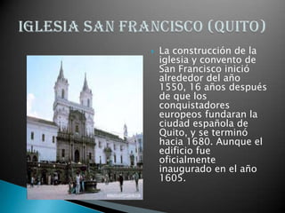 Este documento describe varias iglesias históricas del Ecuador. Detalla que la construcción de la iglesia de San Francisco en Quito comenzó en 1550 y terminó en 1680. Luego describe que la construcción de la Catedral de Cuenca comenzó en 1885 y no fue completada hasta 1975 debido a su excesivo peso. Finalmente, resume que la Catedral de Ambato fue inaugurada en 1954 para reemplazar la iglesia anterior dañada por un terremoto, y que la iglesia de Santa Faz en Ambato es un estilo gótico declarado patrimon