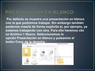 El documento proporciona instrucciones sobre cómo crear y guardar presentaciones en PowerPoint, incluyendo cómo crear una nueva presentación en blanco, usar plantillas, guardar una presentación como archivo o página web, y abrir una presentación existente. También describe las diferentes vistas disponibles como la vista normal, clasificador, y lectura y cómo navegar entre diapositivas en la vista de presentación.