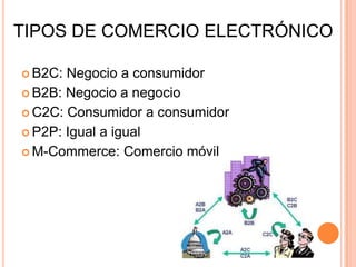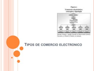 Este documento describe los diferentes tipos de comercio electrónico, incluyendo B2C (negocio a consumidor), B2B (negocio a negocio), C2C (consumidor a consumidor), P2P (igual a igual) y M-Commerce (comercio móvil). Explica las características clave de cada tipo, como las ventajas del comercio B2C para los consumidores y las empresas, y cómo el comercio B2B puede reducir costos y ampliar mercados. También define el intercambio entre consumidores a trav