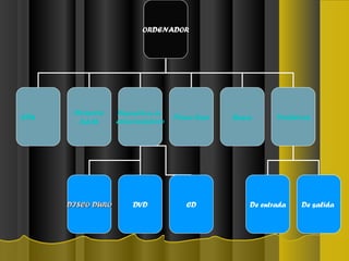 El documento describe los principales componentes de un ordenador, incluyendo la CPU, memoria RAM, dispositivos de almacenamiento como el disco duro, DVD y CD, la placa base, buses y periféricos de entrada y salida. También explica conceptos como la fragmentación del disco duro, sistemas operativos, línea de comandos, copias de seguridad y restauración del sistema.