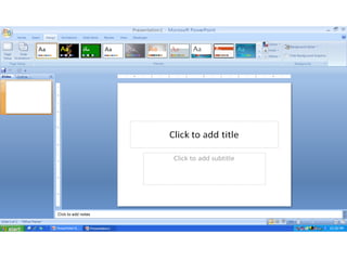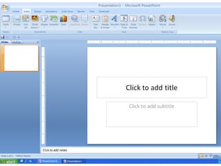 Este documento presenta los objetivos y conceptos básicos sobre el uso de Microsoft PowerPoint. Explica cómo añadir diapositivas, trabajar con texto, insertar imágenes, capturar imágenes de la pantalla, añadir diseño y guardar la presentación. También incluye sugerencias sobre el uso efectivo de PowerPoint en la enseñanza.