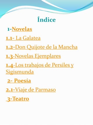 Miguel de Cervantes cultivó diversos géneros narrativos como la novela pastoril, picaresca y bizantina. Sus principales obras incluyen La Galatea, Don Quijote de la Mancha, Novelas Ejemplares y Los trabajos de Persiles y Sigismunda. También escribió poesía como Viaje del Parnaso y teatro, aunque tuvo menos éxito en este último género.