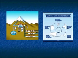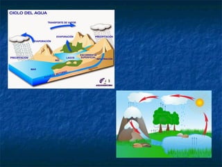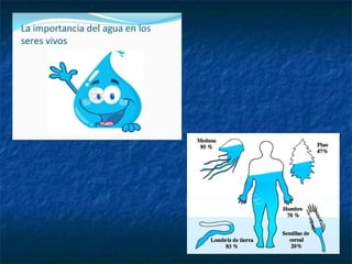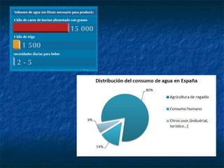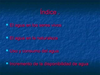 Este documento describe el ciclo del agua en la naturaleza y su importancia para los seres vivos. Explica que aunque el agua cubre el 70% de la superficie de la Tierra, solo el 1% es apta para el consumo humano. Detalla los usos del agua, incluyendo el consumo agrícola e industrial, y las formas de incrementar la disponibilidad de agua como embalses, trasvases y desalación.