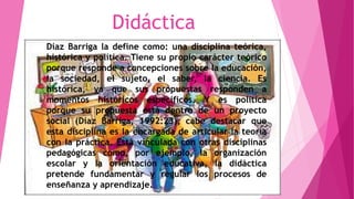 La didáctica estudia los procesos de enseñanza y aprendizaje, y busca plasmar las teorías pedagógicas en la práctica a través de técnicas y métodos efectivos. Está vinculada a otras disciplinas como la organización escolar y pretende fundamentar y regular los procesos de enseñanza-aprendizaje. Existen diferentes modelos didácticos que han evolucionado a lo largo de la historia.