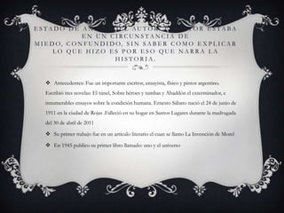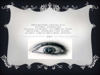 El documento resume la novela "El túnel" de Ernesto Sábato. Explica que el autor escribió la historia en un estado de miedo y confusión tratando de explicar sus acciones. También proporciona antecedentes sobre Sábato, motivos para leer la obra, ejemplos de figuras literarias usadas y llega a la conclusión de que la novela relata una gran frustración que siempre será recordada.