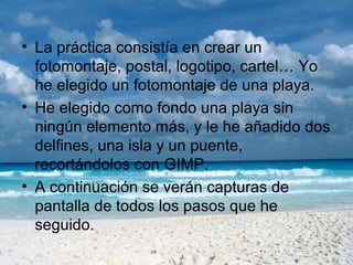 Teresa Nuevo creó un fotomontaje de una playa utilizando GIMP. Recortó imágenes de una isla, un puente y dos delfines de Internet y las colocó como capas sobre una imagen de fondo de una playa. También añadió efectos como destellos y ajustes de color para mejorar el resultado final.