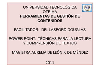 Este documento presenta diferentes técnicas para mejorar la comprensión lectora, incluyendo realizar lecturas preliminares, analíticas y críticas de un texto. También describe la lectura informativa, comprensiva y de estudio, y recomienda técnicas como subrayar ideas principales y usar diccionarios para desarrollar una mejor comprensión.