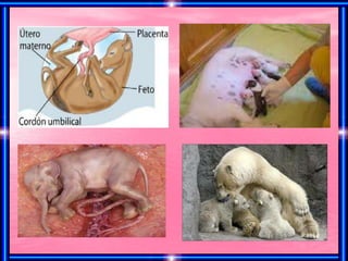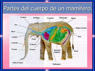 Este documento describe las características principales de los mamíferos. Los mamíferos tienen un esqueleto con una columna vertebral dividida en regiones y su cuerpo se divide en cabeza, tronco y extremidades. Se reproducen sexualmente a través de la unión de células sexuales del macho y la hembra. Tienen sistemas digestivo y respiratorio que incluyen el tubo digestivo y los pulmones.