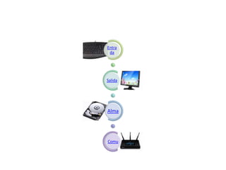 Este documento clasifica y describe los diferentes tipos de periféricos de una computadora: periféricos de entrada, que permiten introducir datos a la computadora; periféricos de salida, que reciben información procesada para hacerla perceptible al usuario; periféricos de almacenamiento, que guardan los datos para su uso futuro; y periféricos de comunicación, que permiten la interacción entre computadoras o entre una computadora y otros dispositivos externos. Proporciona ejemplos comunes para cada categoría de periféricos.