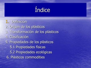 Este documento proporciona una introducción a los plásticos. Define los plásticos como polímeros formados por largas cadenas de átomos de carbono. Explica que los plásticos pueden ser naturales u obtenidos sintéticamente a partir de petróleo. Describe cómo se transforman los plásticos mediante el uso de cargas y aditivos. Clasifica los plásticos en termoplásticos, termoestables y elastómeros. Finalmente, discute las propiedades físicas y ecológicas